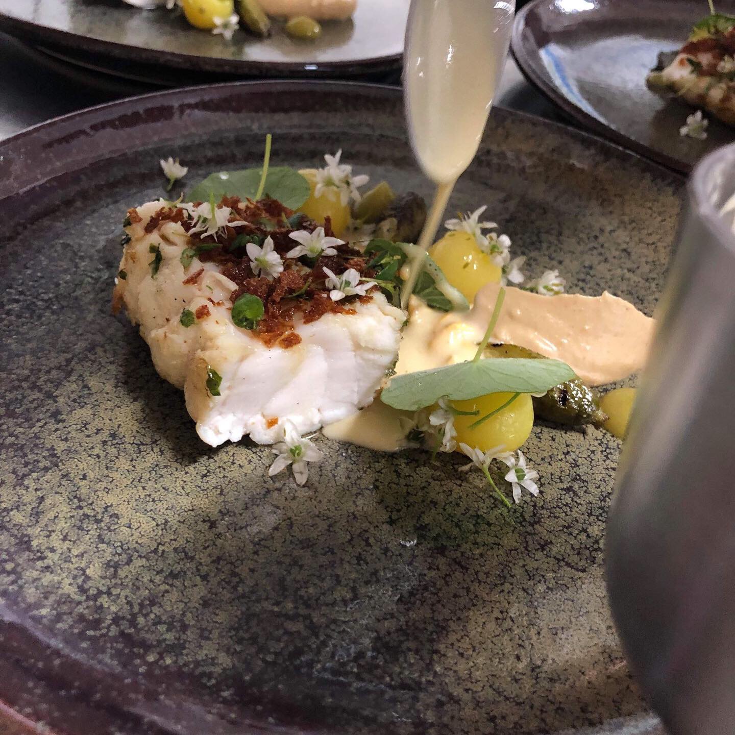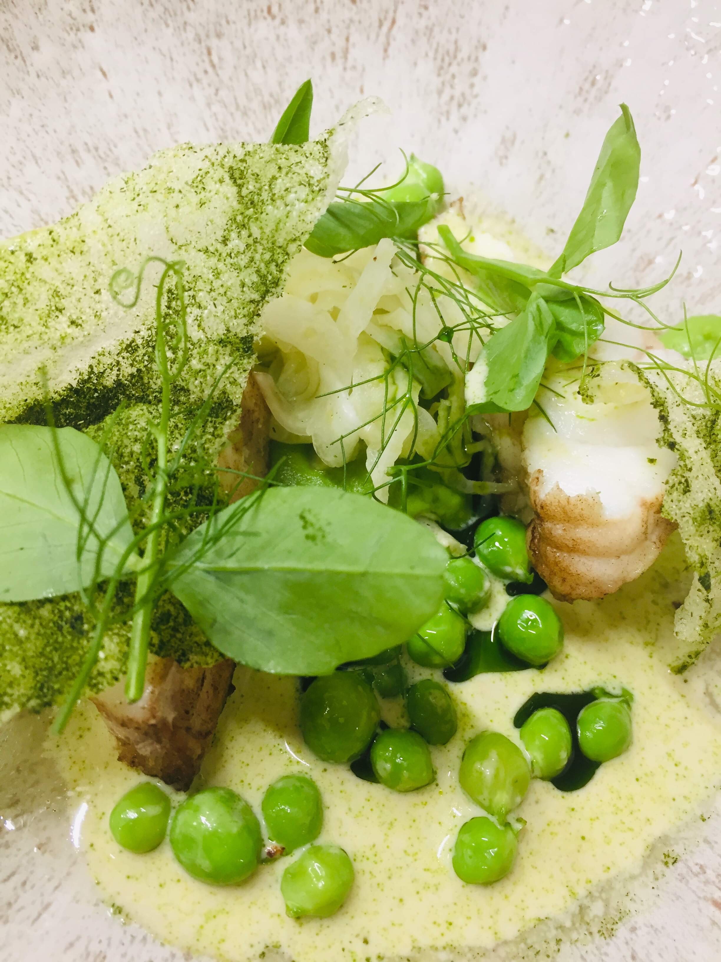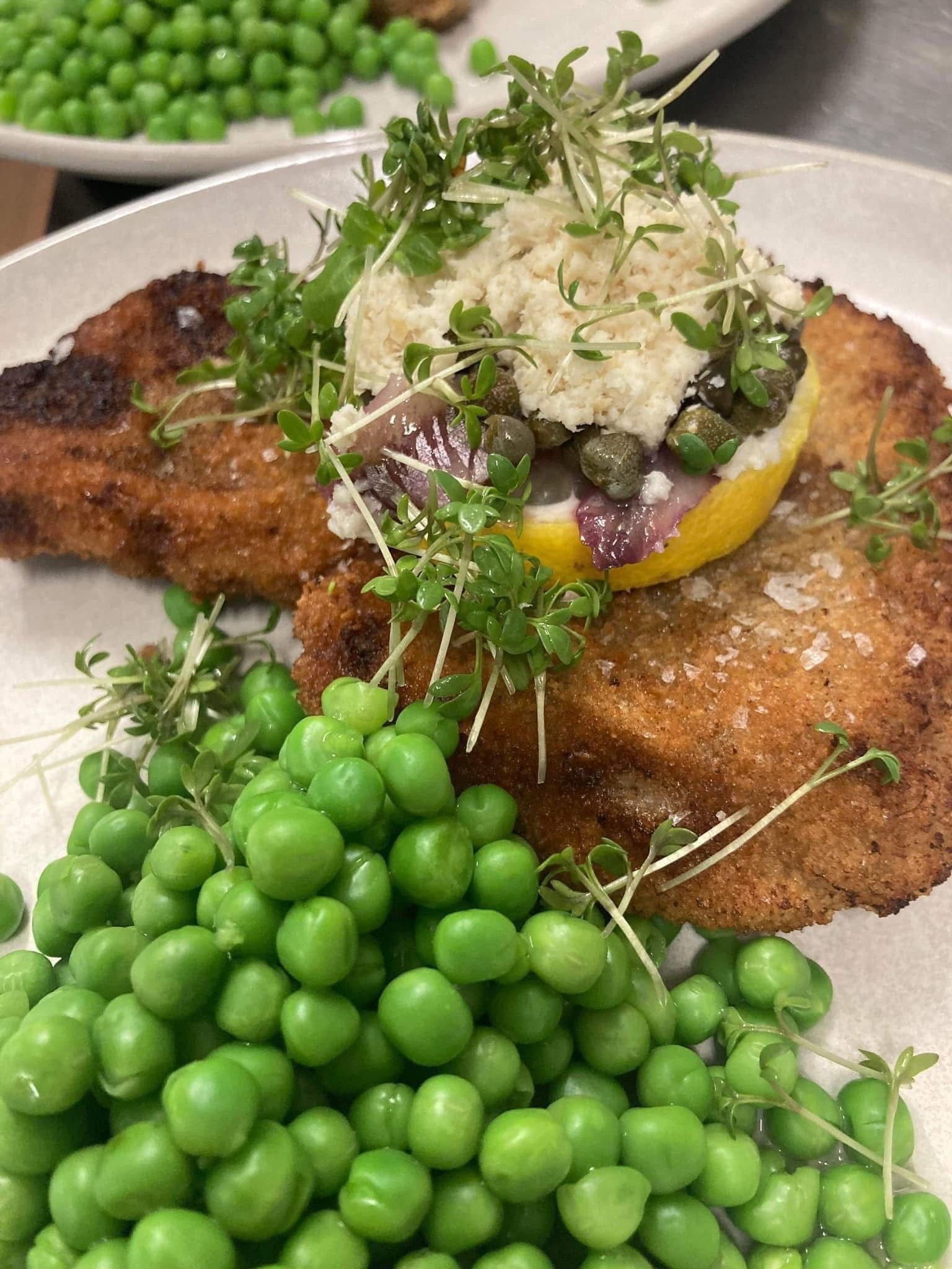 Hovedret: Schnitzel af krogmodnet gris fra Grambogård, med sæsonens grønt, peberrod, kapers, sylt, ansjos, brunet smør og smørvendte kartofler